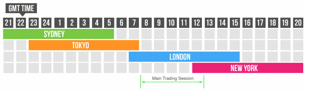 Quatre grandes sessions rythment 24 heures : Londres (Europe), New York (États-Unis), Tokyo (Japon), Sydney (Australie). Certaines se chevauchent, multipliant les occasions pour les plus dynamiques.