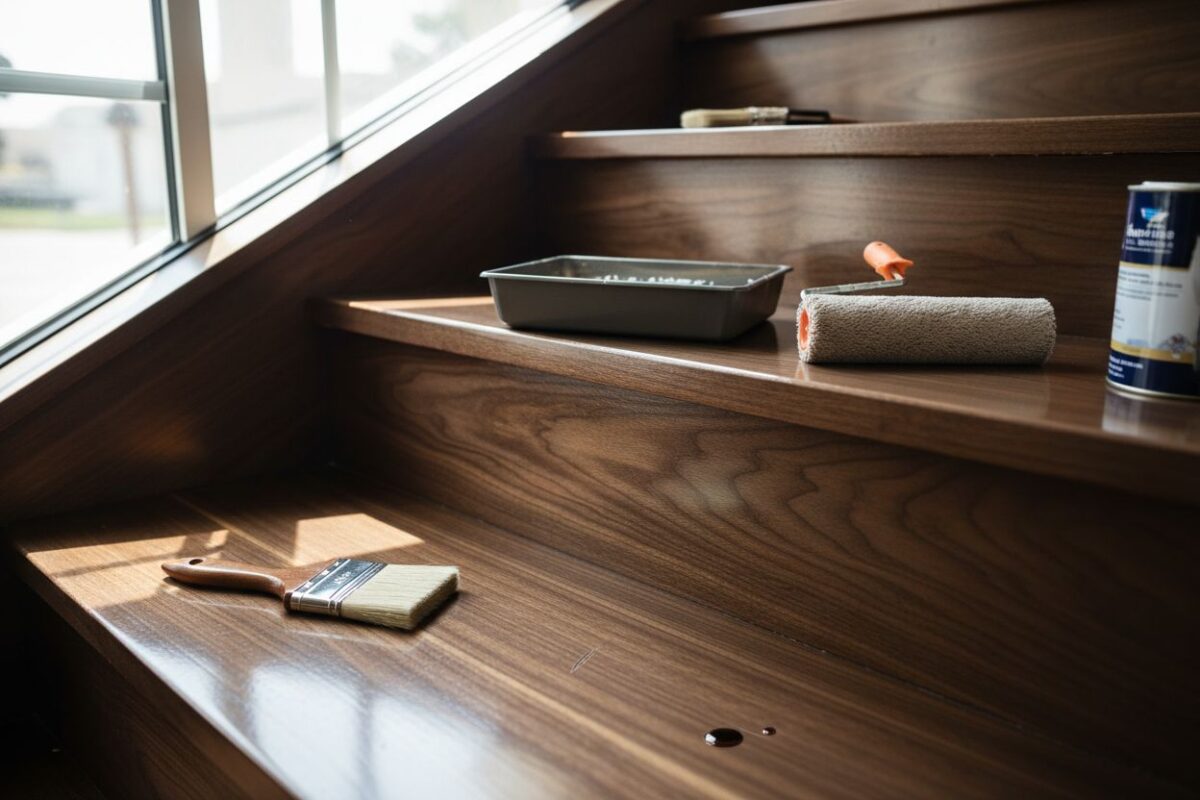 Application du vitrificateur sur escalier en bois